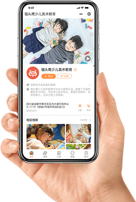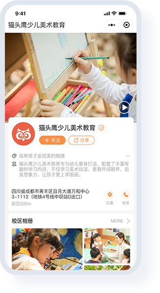 快速创建专属的校区官网,以文字/图片/视频等多种形式,全方面 展示校区相册、教师团队、教学介绍和校区课程等内容。同时支持 一键拨号、地图导航、一键分享、专属海报等功能,打造能宣传能 招生的综合性营销平台,帮助校区实现品牌营销。