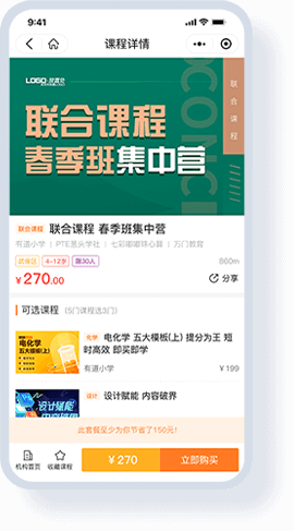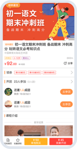 抓住用户组团报名的消费方式,促进老用户开团和邀请好友,降低 校区招生成本的同时,提高招生数量。创建流程简单,订单信息一 目了然,轻松实现线上裂变,高性价比吸引客户,挖掘潜在生源, 实现社区营销。