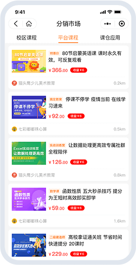 “分销工具”可以让学员加入您的分销队伍,轻松搭建自有分销团 队,分享购买、智能返现、避免了佣金不方便主动索取的尴尬,增 强老带新的积极性。课仓“分销市场”功能,激发平台分享达人, 建立范围更广的分销渠道、让你轻松实现全网分销,通过分销奖励 引发裂变传播,帮助校区宣传招生。