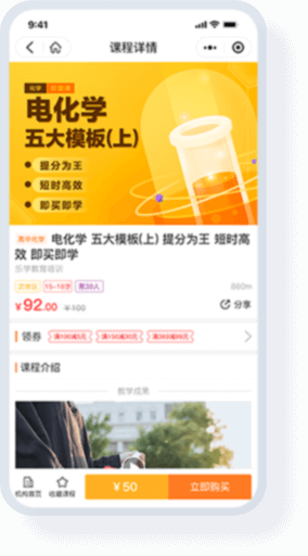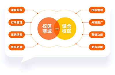 校区公众号接入课仓平台,在课仓转变为你的专属校区商城的同时, 还可拥有丰富的营销功能,融合课仓推广及分销资源,将校区原有粉 丝流量代入校区商城。